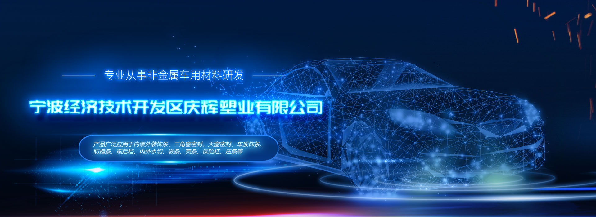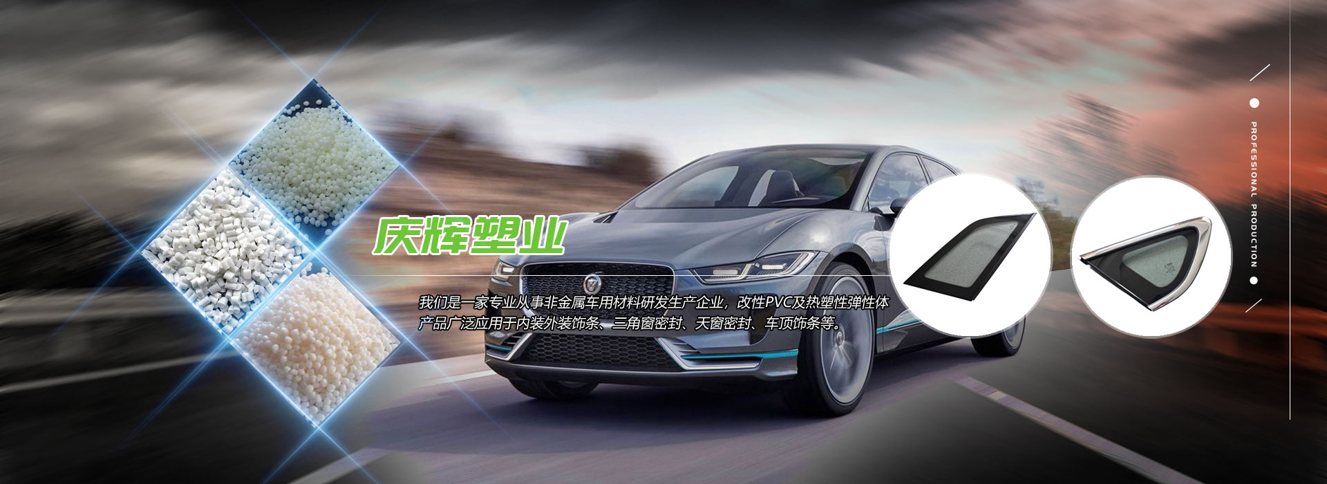 寧波經濟技術開發區(qu)慶輝塑(su)業(ye)有限(xian)公司是一(yi)家專業(ye)從事非金(jin)屬車用(yong)(yong)材料研(yan)發生(sheng)產企業(ye),改性PVC及(ji)熱塑(su)性彈性體(TPE、TPV、TPR)產品廣泛(fan)應(ying)用(yong)(yong)于內裝外(wai)裝飾條(tiao)、三角窗密(mi)封、天窗密(mi)封、車頂(ding)飾條(tiao)、防裝條(tiao)、前后檔、內外(wai)水切(qie)、嵌(qian)條(tiao)、亮條(tiao)、保險杠、壓條(tiao)、防滑板(ban)、各種護邊條(tiao)、上裝側(ce)裝飾條(tiao)--函蓋汽車的(de)方(fang)方(fang)面面,力(li)爭為全球客戶提供更(geng)專業(ye)、更(geng)優質的(de)產品、服務和(he)解決方(fang)案。