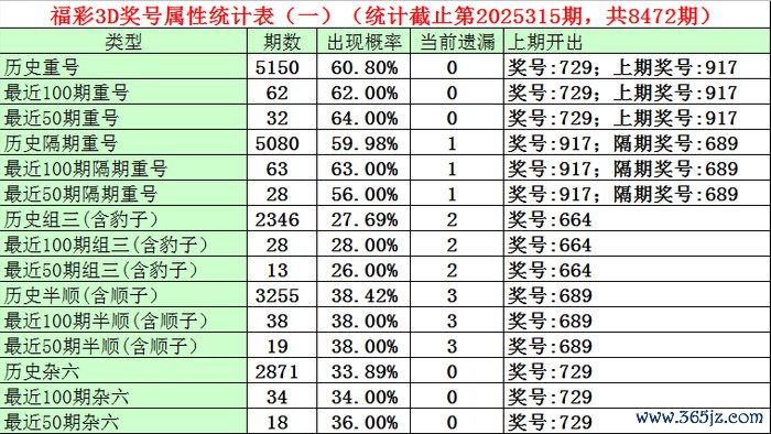 福彩3D上期奖号为729,上期开出重号79。最近100期重号开出62期,开出比例62%,最近50期重号开出32期,开出比例64%,最近10期重号开出 7期,出现比例为70%,本期细心重号出现。